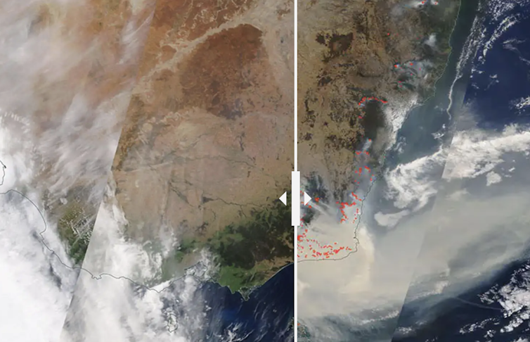 Editor’s note: We pulled four before-and-after-images from NASA’s Worldview application, and asked bushfire researcher Grant Williamson to reflect on the story they tell. Here’s what he told us: